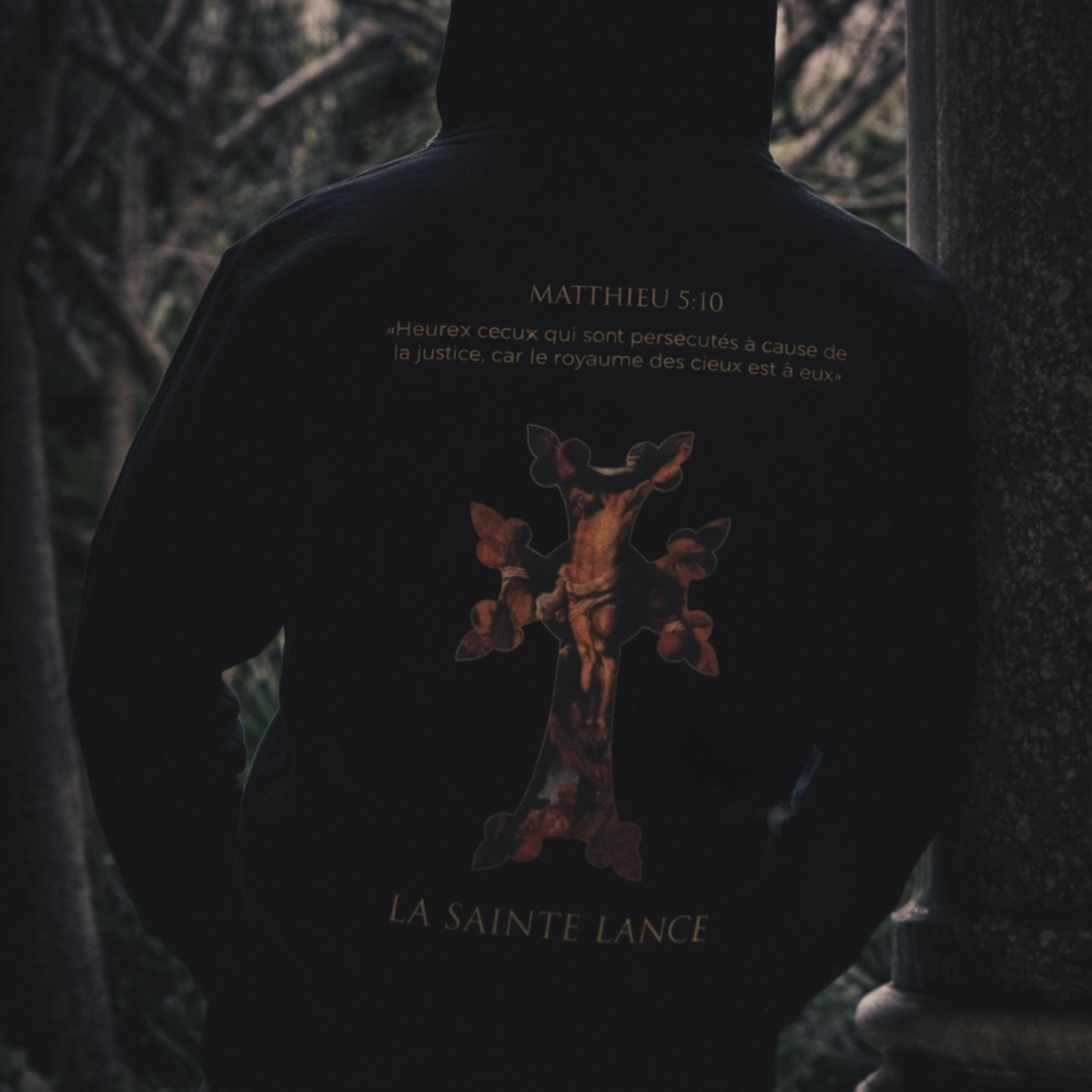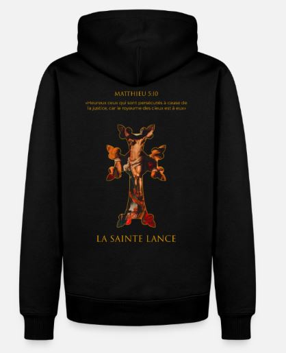 Sweat a capuche avec katchkar dans le dos ayant l ' incrustation du tableau de Rubens ( 1637 ) La Sainte - Lance , inscription tiré de la sainte écriture faisant allusion au martyrs et a la passion du christ.